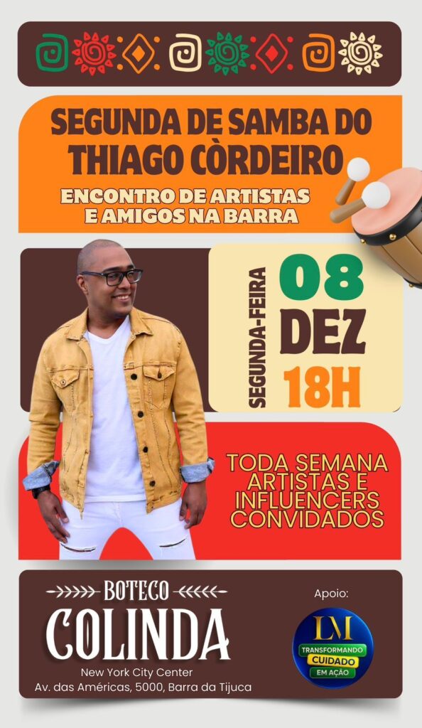 Thiago Cordeiro promete clima de festa — afinal, já estamos na reta final do ano, quase saudando 2026. No repertório, sucessos que já caíram no gosto do público e das playlists, como “Segura a Saudade” (Arlindo Cruz, Babi Cruz e Jr. Dom.), “A Lã e o Cobertor” (Jorge Aragão e Xande de Pilares), “Teu Sono” (Thiago Cordeiro e Átila Alves) e “Se Permita”, além das grandes pérolas do samba brasileiro e dos pagodinhos imortais de nomes como Molejo, Arlindo Cruz, Xande de Pilares e Jorge Aragão.