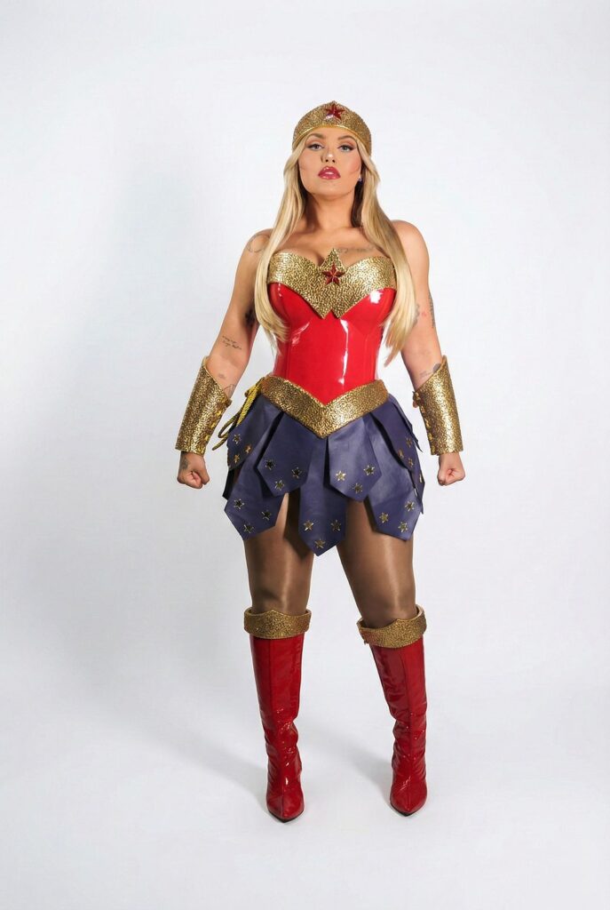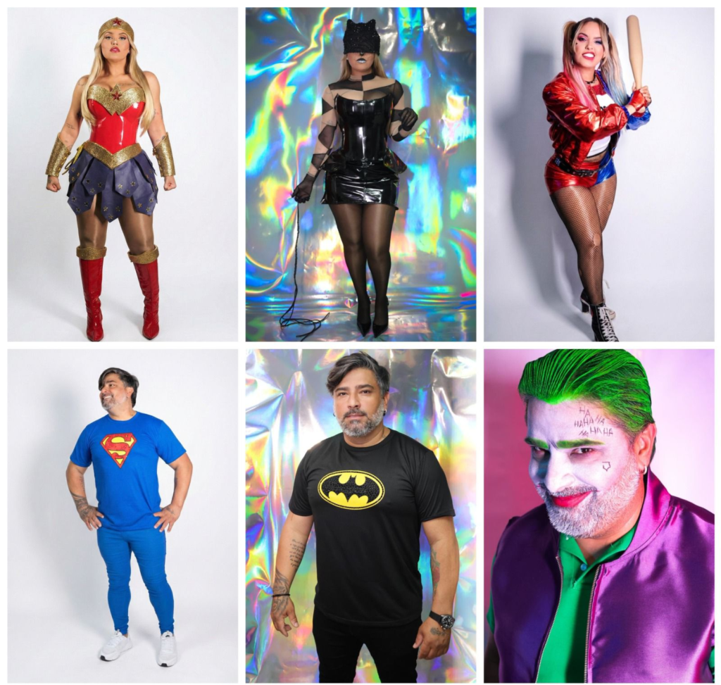 Entre as produções de Yara Tchê, a Mulher-Gato ganhou releitura inspirada em uma referência mais realista baseada em Ariana Grande, com cabeça/máscara estruturada em arame, totalmente coberta com renda e mais de mil cristais aplicados manualmente. A Mulher-Maravilha veio do universo cartoon da DC, construída com técnicas de cosplay e cosmaker, tendo todas as peças douradas cobertas manualmente e cravejadas com cerca de cinco mil mini cristais. Já a Arlequina teve como base o filme em live action, com figurino fiel à versão cinematográfica e mais de cinco mil cristais aplicados manualmente. Alessandro também entrou na temática e surgiu caracterizado como Batman, Superman, Capitão América e Coringa, ampliando a atmosfera lúdica dos shows.