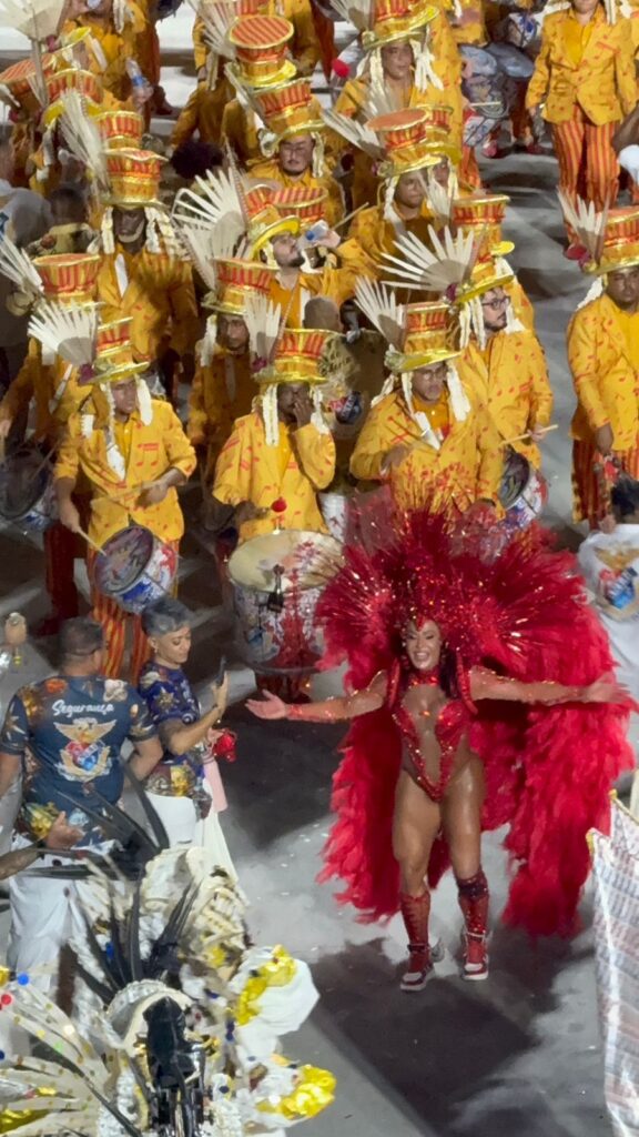 Um dos momentos mais aguardados da noite foi a entrada da rainha de bateria Graciane Barbosa, que voltou ao posto neste ano e protagonizou um verdadeiro show à parte. Com uma fantasia exuberante em tons de vermelho, repleta de plumas e brilho, a musa esbanjou carisma, samba no pé e muita energia, conduzindo os ritmistas com imponência e simpatia. Sua performance arrancou aplausos e gritos de entusiasmo do público, consolidando seu retorno como um dos grandes destaques do desfile.